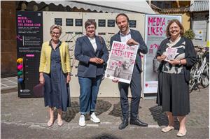 Kommunikationsbeirats-Präsidentin Judith Gögele (2. v.l.) mit Landesrat Philipp Achammer, VHS-Präsidentin Angelika Mayr Fischnaller (1. v.l.) und Anika Michelon, Direktorin des Amts für Weiterbildung und Sprachen (Foto: LPA/Stuefer)